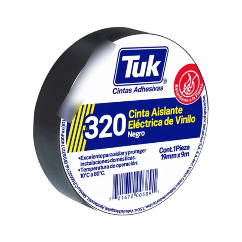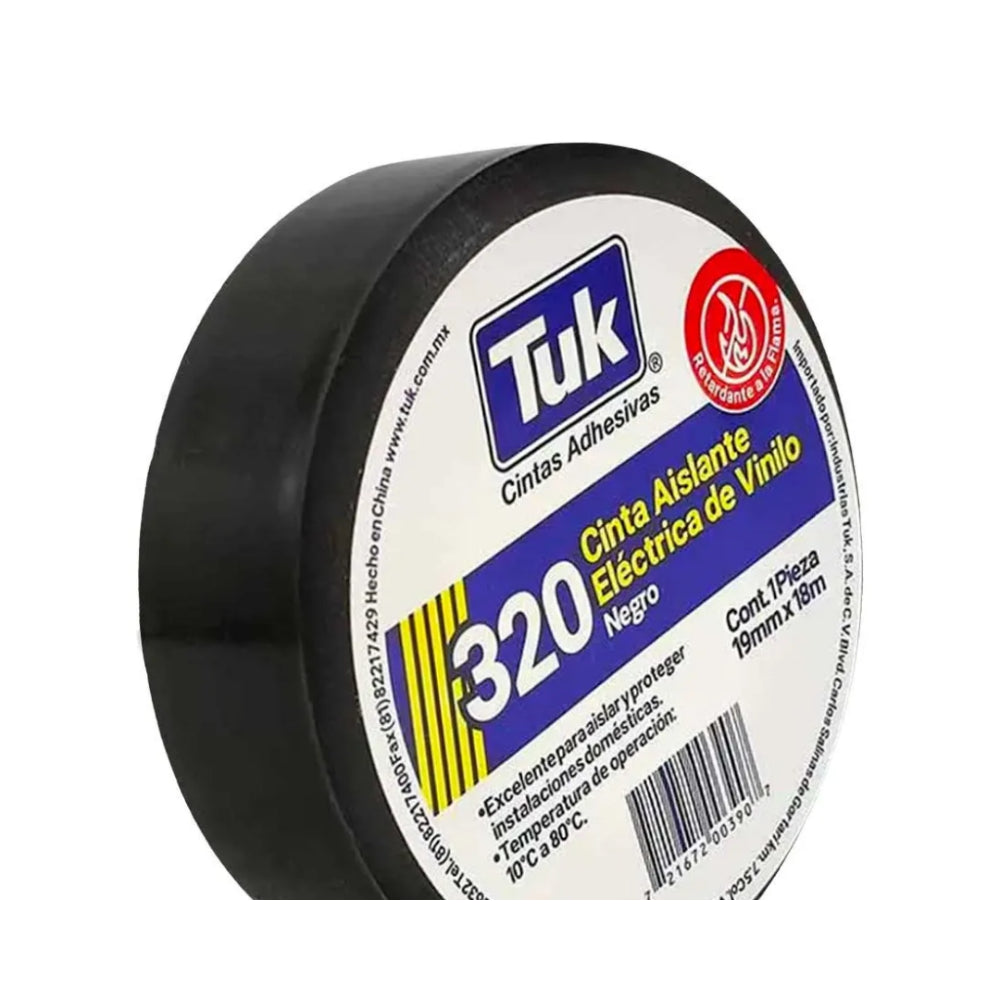 Cinta aislante de vinil negro con dimensiones de 19 mm de ancho por 18 metros de largo, modelo 320 Tuk. Ideal para aplicaciones eléctricas, ofrece excelente aislamiento y resistencia al desgaste, asegurando protección confiable en instalaciones y reparaciones.