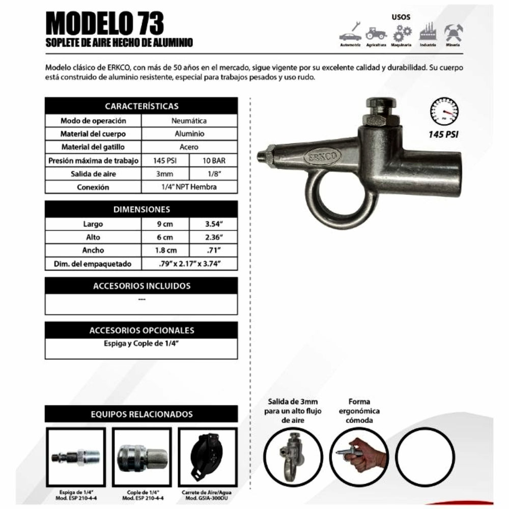 Modelo clasico de ERKCO, con mas de 50 anos en el mercado, sigue vigente por su excelente calidad y durabilidad. Su cuerpo esta construido de aluminio resistente, especial para trabajos pesados y uso rudo.